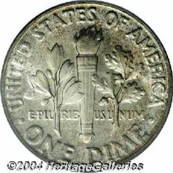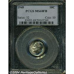 <B>1949<10C> MS68 Full Bands PCGS.</B></I> Fully lustrous surfaces are bathed by multicolored toning on the obverse, and a touch of light gold patina on the reverse. The design elements are sharply impressed, culminating in Full Band designation, and the surfaces are devoid of impairments. Population: 1 in 68, 0 finer (9/04). <BR><BR><B>Important notice:</B> Heritage usually auctions material at the rate of 200-250 lots per hour. On some occasions eBay Live bid software or the Internet may not be able to keep up with the pace of the auction. We recommend placing a realistic absentee bid now as insurance to avoid disappointment. Occasionally the auctioneer may eliminate or reject an eBay Live bid, and the auctioneer may also reopen a lot after the close of the eBay live bidding (usually because we missed an audience bid), and may reject your bid even if it shows you as the winning bidder. By bidding via eBay Live, you agree that Heritage may award the lot to another bidder at its sole discretion under the circumstances described above or any other reasonable circumstances. Since eBay bids are not shown to us until we open the lot on the floor, we treat those bids just like floor bids. In most cases the floor responds before the eBay bid is presented to us, due to Internet lag time, so for consistency we have made it a policy that floor bids are always considered first over tie eBay live bids. Also please note that all Heritage lots purchased through eBay Live carry a 20% Buyer's Premium. Please make sure you read the Terms and Conditions before you bid.