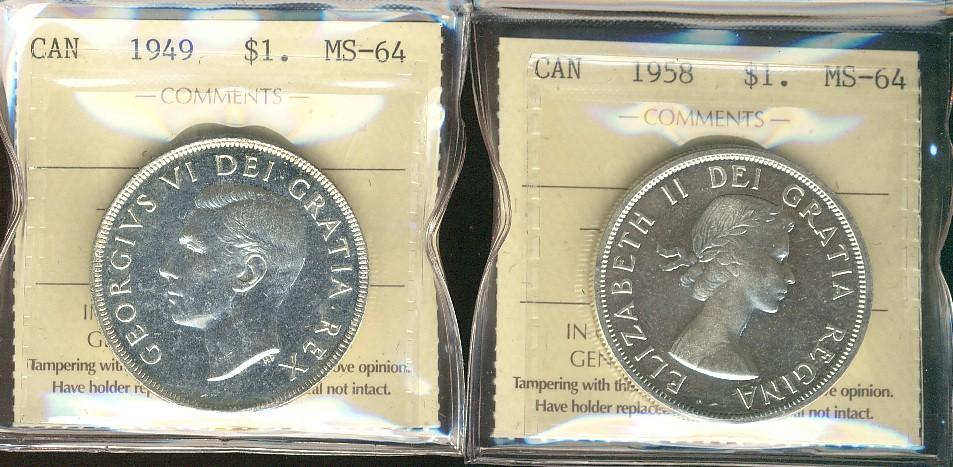 1949 & 1958 $1 ICCS MS64. Lot of 2 coins.