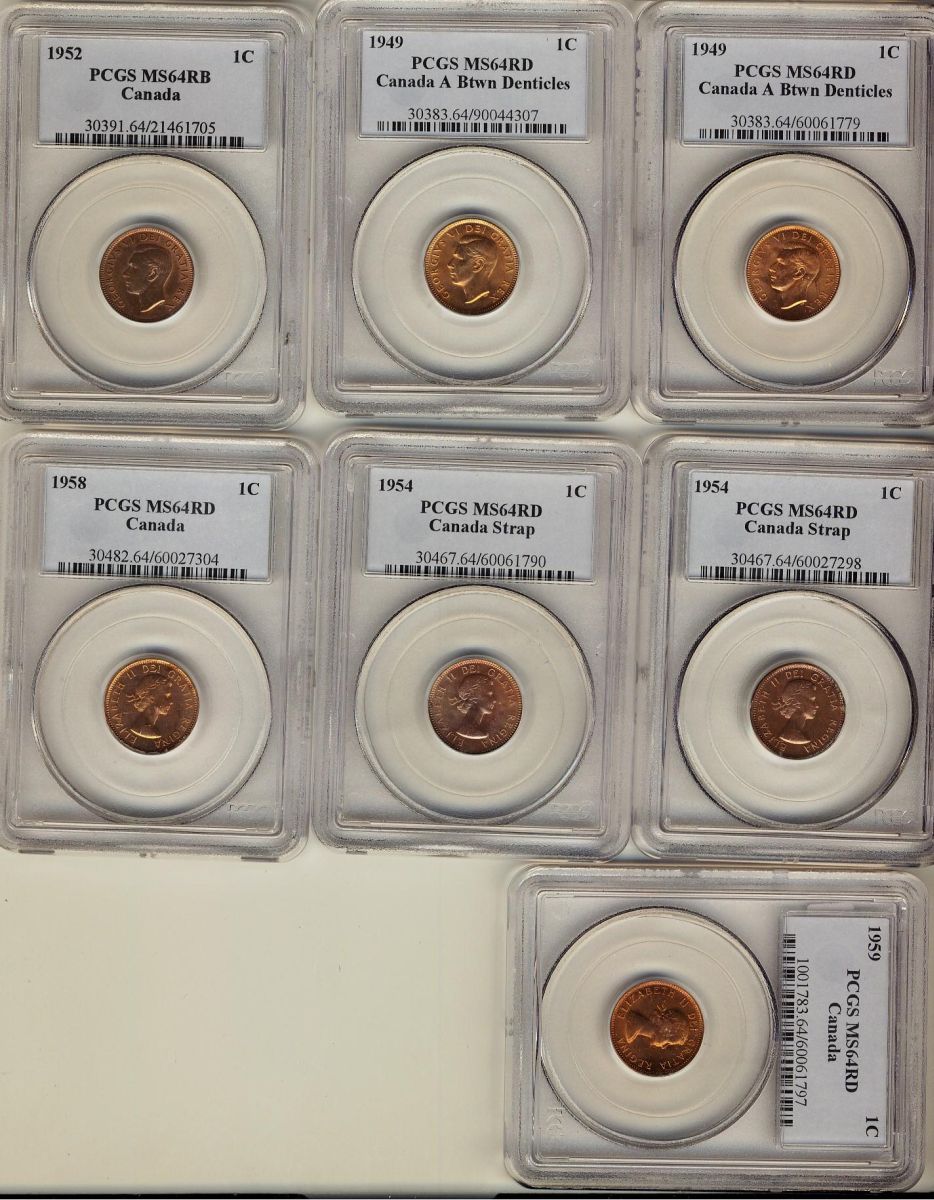 1949-1959 1¢ PCGS MS64RD. Lot of seven coins all red except one RB example. Includes 1949 A betw (2), 1952 RB, 1954 (2), 1958 and 1959.