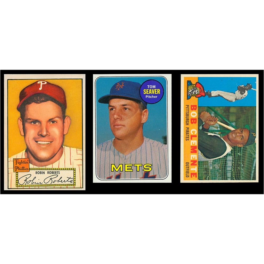 Ungraded Cards - 1949 Bowman: 8 cards with #56, 87, 88, 92, 93, 126A (script), 141 and 177. Grades VG to EX. 1952 Topps: 3 cards, #59 Roberts (GD), 93 (FR) and 97 (trimmed). 1954 Topps: 2 cards with #154, 178 (both EX). 1960 Topps: 1 card, 326 Clemente (VG). 1965 Topps: 4 cards (VG unless noted) with #120 F. Robinson, 130 Kaline, 150 B. Robinson and 155 Maris (GD/VG). 1969 Topps: 3 cards with #190 Mays (VG), 480 Seaver (NM), 597 Fingers RC (VG/EX). 1970 Topps: 10 cards with #10 Yaz, 140 Reggie, 230 Robinson, 290 Carew, 300 Seaver, 350 Clemente, 459 Reggie AS, 462 Aaron AS, 470 Stargell and 500 Aaron (GD/VG). Grades GD/VG to VG/EX. 1973 Topps: 1 card, #220 Ryan (NM).