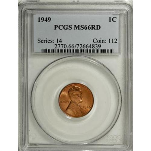 <B>1949 1C MS66 Red PCGS.</B></I> PCGS Population (302/8). NGC Census: (333/33). Mintage: 217,775,008. Numismedia Wsl. Price for NGC/PCGS coin in MS66: $75. (#2770)<BR><BR><B>Coin Engraver:</B> Victor D. Brenner<BR><BR><b>Shipping:</b> Coins & Currency (<a target="_blank" href="http://www.heritageauctions.com/common/shipping.php">view shipping information</a>)