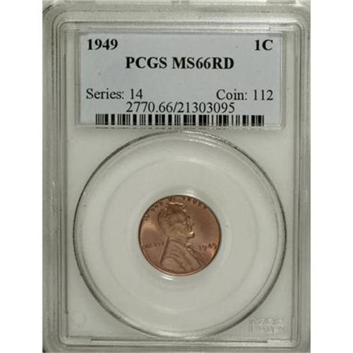<B>1949 1C MS66 Red PCGS.</B></I> PCGS Population (302/8). NGC Census: (333/33). Mintage: 217,775,008. Numismedia Wsl. Price for NGC/PCGS coin in MS66: $75. (#2770)<BR><BR><B>Coin Engraver:</B> Victor D. Brenner<BR><BR><b>Shipping:</b> Coins & Currency (<a target="_blank" href="http://www.heritageauctions.com/common/shipping.php">view shipping information</a>)