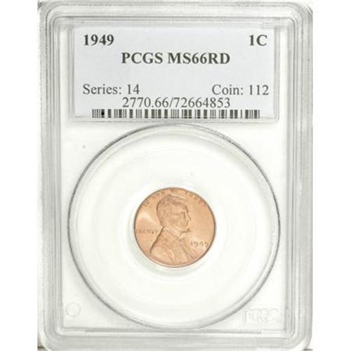 <B>1949 1C MS66 Red PCGS.</B></I> PCGS Population (308/8). NGC Census: (335/33). Mintage: 217,775,008. Numismedia Wsl. Price for NGC/PCGS coin in MS66: $100. (#2770)<BR><BR><B>Coin Engraver:</B> Victor D. Brenner<BR><BR><b>Shipping:</b> Coins & Currency (<a target="_blank" href="http://www.heritageauctions.com/common/shipping.php">view shipping information</a>)