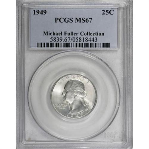 <B>1949 25C MS67 PCGS.</B></I> Highly lustrous with a faint trace of olive-gold toning on the right side of the reverse. This well struck Superb Gem has hardly any distractions, save for a single small mark on the eagle's breast. Population: 33 in 67, 1 finer (10/07). <BR><I>From The Michael Fuller Collection.</B></I><BR><BR><B>Coin Engraver:</B> John Flanagan<BR><BR><b>Shipping:</b> Coins & Currency (<a target="_blank" href="http://www.heritageauctions.com/common/shipping.php">view shipping information</a>)