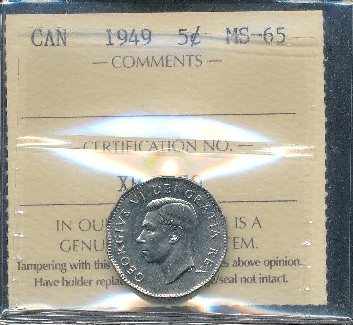 1949 5¢ ICCS MS65. Strong lustrous issue.