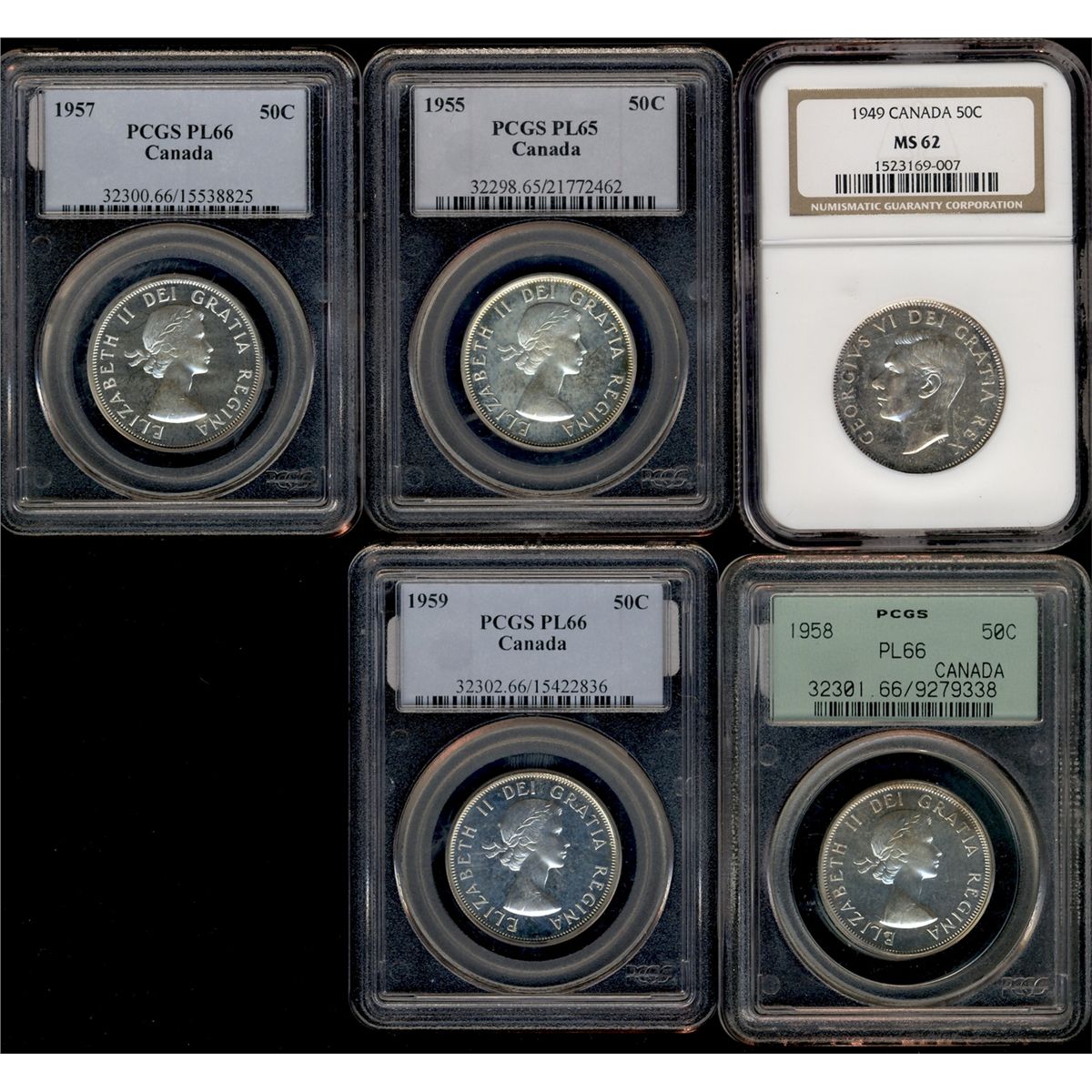 1949 50¢ NGC MS62, 1955 PL65, 1957, 1958 & 1959 all three PL66. Lot of 5 coins all certified PCGS or NGC.