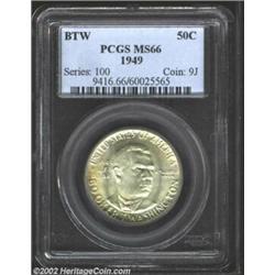 1949 50C Booker T. Washington MS66 PCGS. Dusky gray-gold color swirls about the peripheries. The reverse is well preserved, and the obverse has an immaculate field. Only two coins have been graded higher by PCGS. Important notice: We expect to be auctioning lots at the rate of 200-250 per hour. Sometimes eBay Premier live bid software cannot keep up with that pace, so we strongly recommend that you place a realistic proxy bid now as insurance to avoid disappointment. Also please note that all Heritage/CAA lots purchased through eBay Premier carry a 20% Buyer's Premium. Please make sure you read the Terms and Conditions.