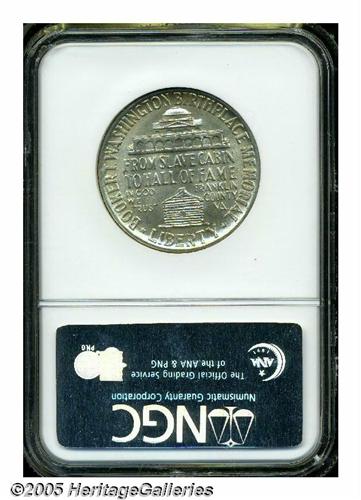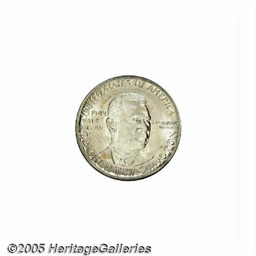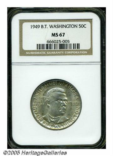 <B>1949<50C> Booker T. Washington MS67 NGC.</B></I> Lightly toned in soft golden and tan shades, the fields exhibit an exceptionally smooth appearance. Just a few minor "chicken scratches" are visible on Washington's mouth and jaw. Every feature is pristine, and the devices are sharply brought up. One of only nine MS67 examples known to NGC and PCGS, and unsurpassable at either certification service (6/05).