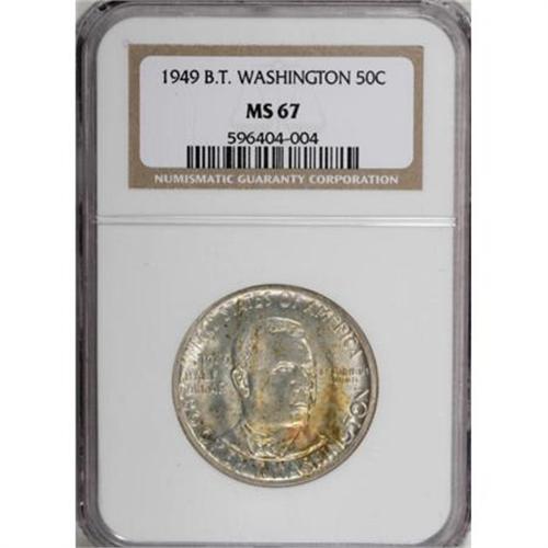 <B>1949 50C Booker T. Washington MS67 NGC.</B></I> Brilliant luster and bold detail for the issue are this piece's strong suits. A splash of reddish-orange in the right obverse field contrasts with the essential brilliance of the reverse. Census: 15 in 67, 0 finer (10/07).<BR><BR><b>Shipping:</b> Coins & Currency (<a target="_blank" href="http://www.heritageauctions.com/common/shipping.php">view shipping information</a>)