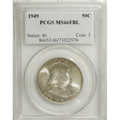 <B>1949 50C MS66 Full Bell Lines PCGS.</B></I> PCGS Population (136/0). NGC Census: (40/0). Numismedia Wsl. Price for NGC/PCGS coin in MS66: $500. (#86653)<BR><BR><b>Shipping:</b> Coins & Currency (<a target="_blank" href="http://www.heritageauctions.com/common/shipping.php">view shipping information</a>)