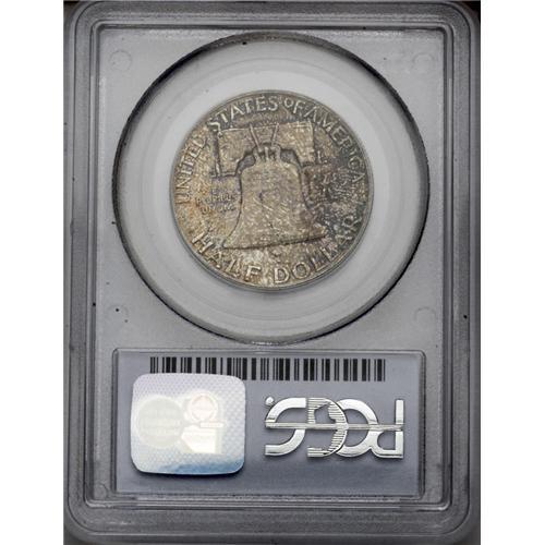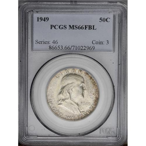 <B>1949<50C> MS66 Full Bell Lines PCGS.</B></I> Speckled russet and dark-green patina appear at the obverse borders, leaving Franklin's portrait essentially untoned and nearly blemish-free. The reverse is almost entirely blanketed by numerous variegated colors that include olive, ruby-red, purple, dark-green, and orange. Both sides reveal razor-sharp striking details and intense full luster. The coin's few trivial coin-to-coin marks are obscured by the rich toning.<BR><I>From The Alex & Nan Registry Sets.</B></I> <BR><BR><B>Important notice:</B> Heritage usually auctions material at the rate of 200-250 lots per hour. On some occasions eBay Live bid software or the Internet may not be able to keep up with the pace of the auction. We recommend placing a realistic absentee bid now as insurance to avoid disappointment. Occasionally the auctioneer may eliminate or reject an eBay Live bid, and the auctioneer may also reopen a lot after the close of the eBay live bidding (usually because we missed an audience bid), and may reject your bid even if it shows you as the winning bidder. By bidding via eBay Live, you agree that Heritage may award the lot to another bidder at its sole discretion under the circumstances described above or any other reasonable circumstances. Since eBay bids are not shown to us until we open the lot on the floor, we treat those bids just like floor bids. In most cases the floor responds before the eBay bid is presented to us, due to Internet lag time, so for consistency we have made it a policy that floor bids are always considered first over tie eBay live bids. Also please note that all Heritage lots purchased through eBay Live carry a 20% Buyer's Premium. Please make sure you read the Terms and Conditions before you bid. This lot is being auctioned in conjunction with a live floor auction by Heritage Galleries & Auctioneers. All final auction and invoice information will be supplied by Heritage Galleries & Auctioneers, and all other information should be considered preliminary. Lot:3074 <BR><BR><B>Winning Notification and Billing:</B> After the FINAL session in this auction is complete, Heritage will send e-mail and snail mail invoices. This process normally takes several days. All final auction and invoice information will be supplied by Heritage Galleries & Auctioneers, and all other information should be considered preliminary. <BR><BR>This auction will be conducted on a live auction floor and over the Internet through eBay Live. If you choose to place an absentee bid, please take a moment to <font color='#0000ff'><u><a href='http://pages.ebay.com/liveauctions/help/before/laabsentee.html'>learn how eBay Live absentee bidding works</a></u></font><font color='#000000'>