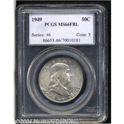 <B>1949<50C> MS66 Full Bell Lines PCGS.</B></I> The soft, frosted mint luster is covered with mottled shadings of deep reddish-russet color. Boldly defined throughout with hardly any visible marks. Population: 94 in 66, 0 finer (3/04). <BR><BR><B>Important notice:</B> Heritage usually auctions material at the rate of 200-250 lots per hour. On some occasions eBay Live bid software or the Internet may not be able to keep up with the pace of the auction. We recommend placing a realistic absentee bid now as insurance to avoid disappointment. Occasionally the auctioneer may eliminate or reject an eBay Live bid, and the auctioneer may also reopen a lot after the close of the eBay live bidding (usually because we missed an audience bid), and may reject your bid even if it shows you as the winning bidder. By bidding via eBay Live, you agree that Heritage may award the lot to another bidder at its sole discretion under the circumstances described above or any other reasonable circumstances. Since eBay bids are not shown to us until we open the lot on the floor, we treat those bids just like floor bids. In most cases the floor responds before the eBay bid is presented to us, due to Internet lag time, so for consistency we have made it a policy that floor bids are always considered first over tie eBay live bids. Also please note that all Heritage lots purchased through eBay Live carry a 20% Buyer's Premium. Please make sure you read the Terms and Conditions before you bid.