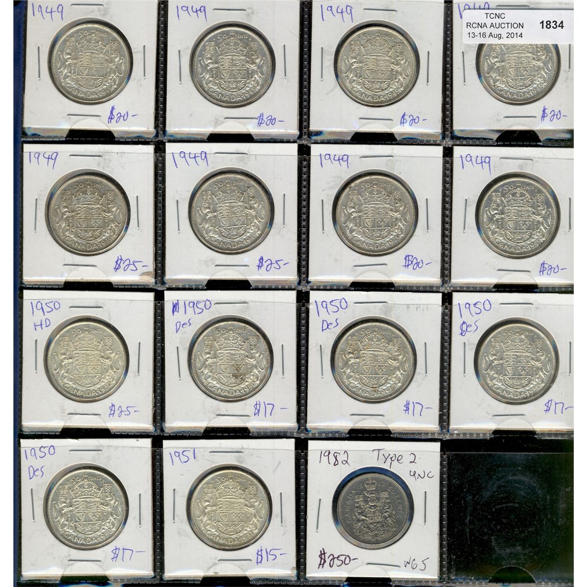 1949(8) 50¢, 1950 Des(5), 1951 & 1982 Type 2. Lot of 15 coins all EF or better.
