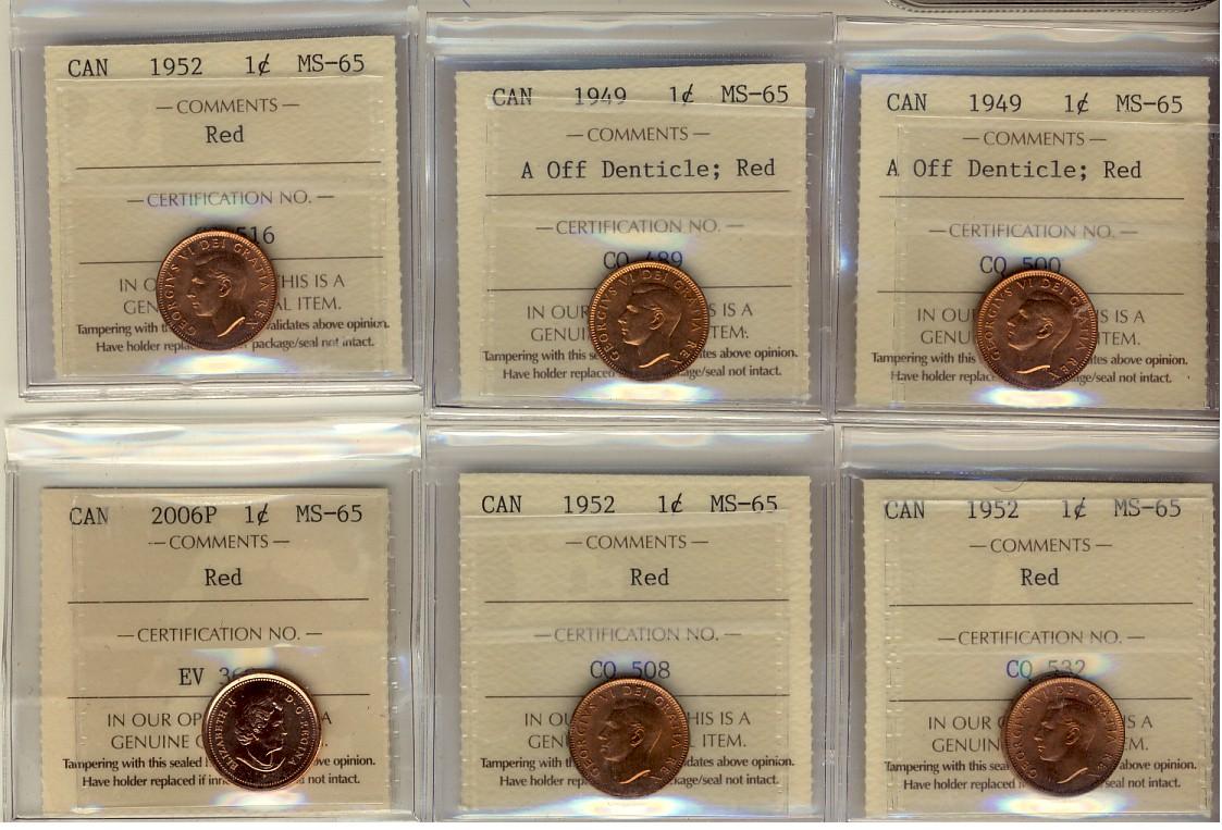 1949 A off(2), 1952 (3) & 2006P 1¢. Lot of 6 coins all ICCS MS65RD.