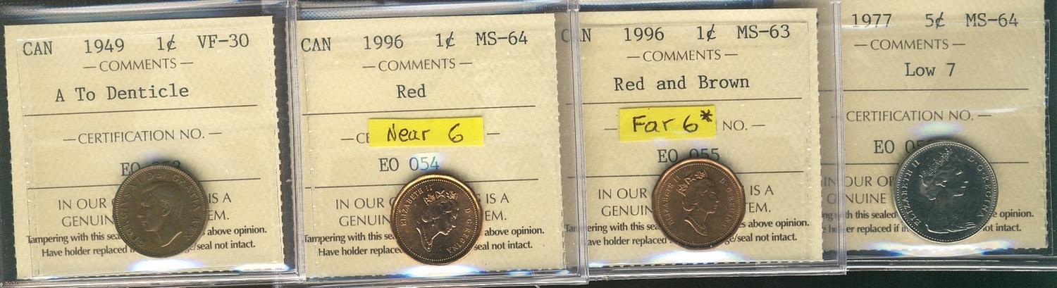 1949 A to Dent, 1996 Far and Near 6 1¢ Varieties, Lot of 4 coins all ICCS graded. 1949 VF30, 1996