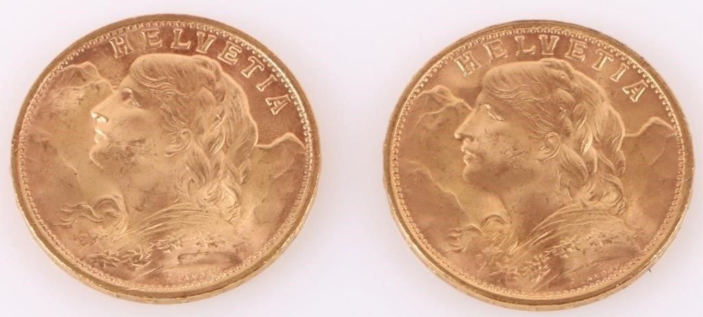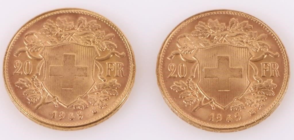 1949 B 90% gold 20 Francs Swiss Helvetia coins. Lot of 2.