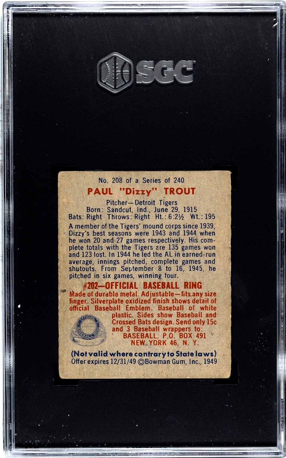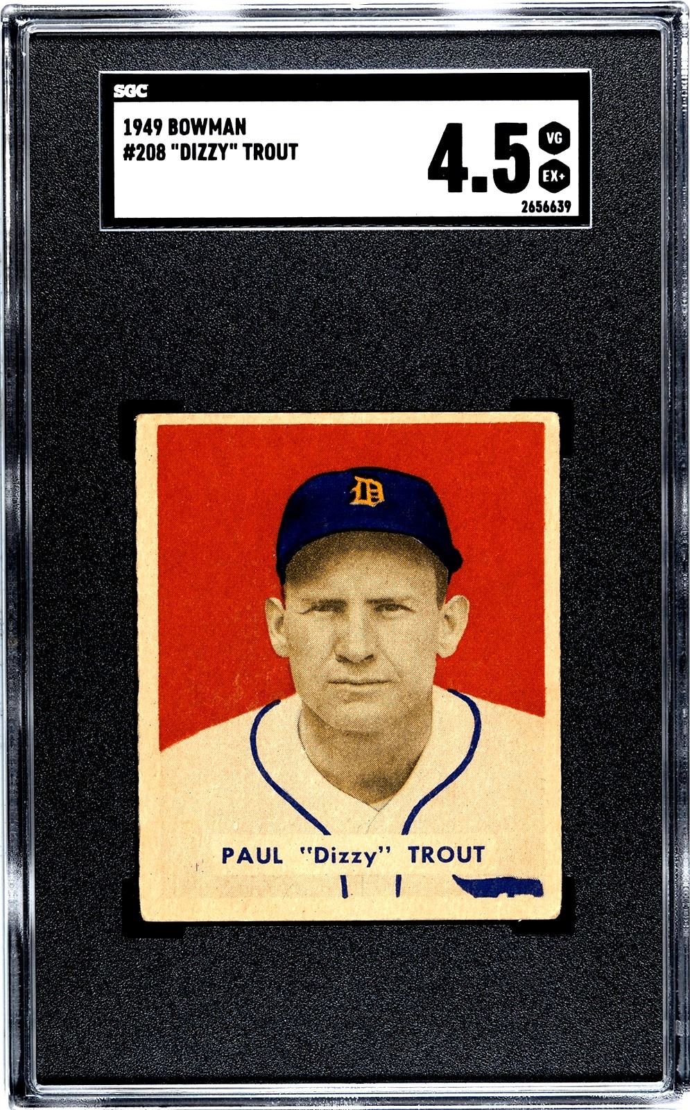 One of the all-time great names, Trout was a solid starting pitcher who lasted 15 seasons in the Majors. From 1942 to 1948 he reached double digits in wins, including 27 in 1944 when he'd lead the AL in ERA (2.12). He won 170 games overall and a World Series with Detroit in 1945. Graded 4.5 VG-EX+ by SGC.