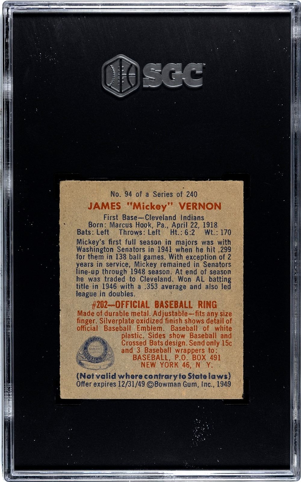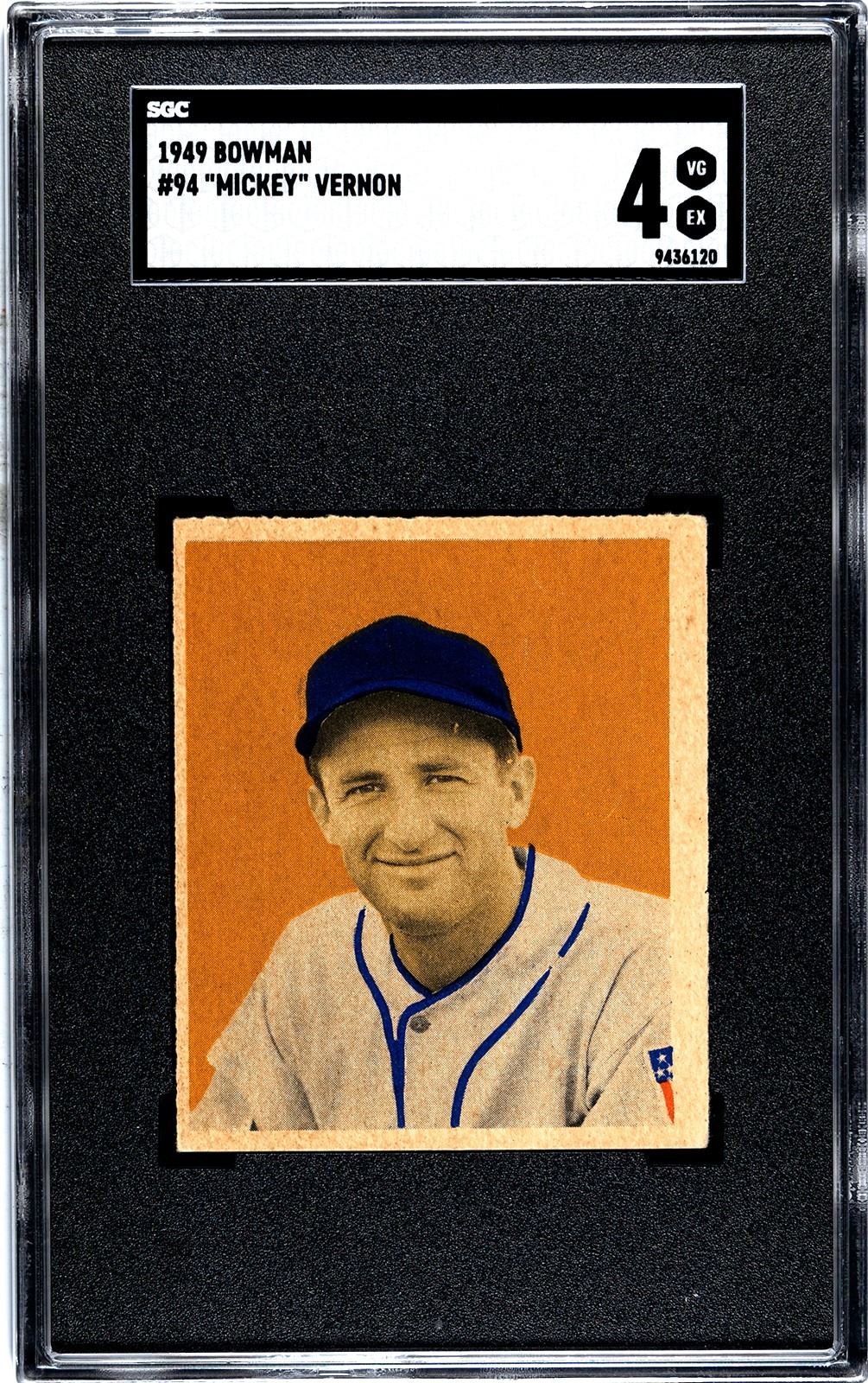 Mickey Vernon was a star, just not a superstar. He played major league baseball for 20 years, over 2,400 games, and compiled a lifetime batting average of .286 with 2,495 hits and 1,311 RBI. He won two batting titles, and led the league in doubles 3x. This, his rookie card, grades a nice 4 VG-EX by SGC.