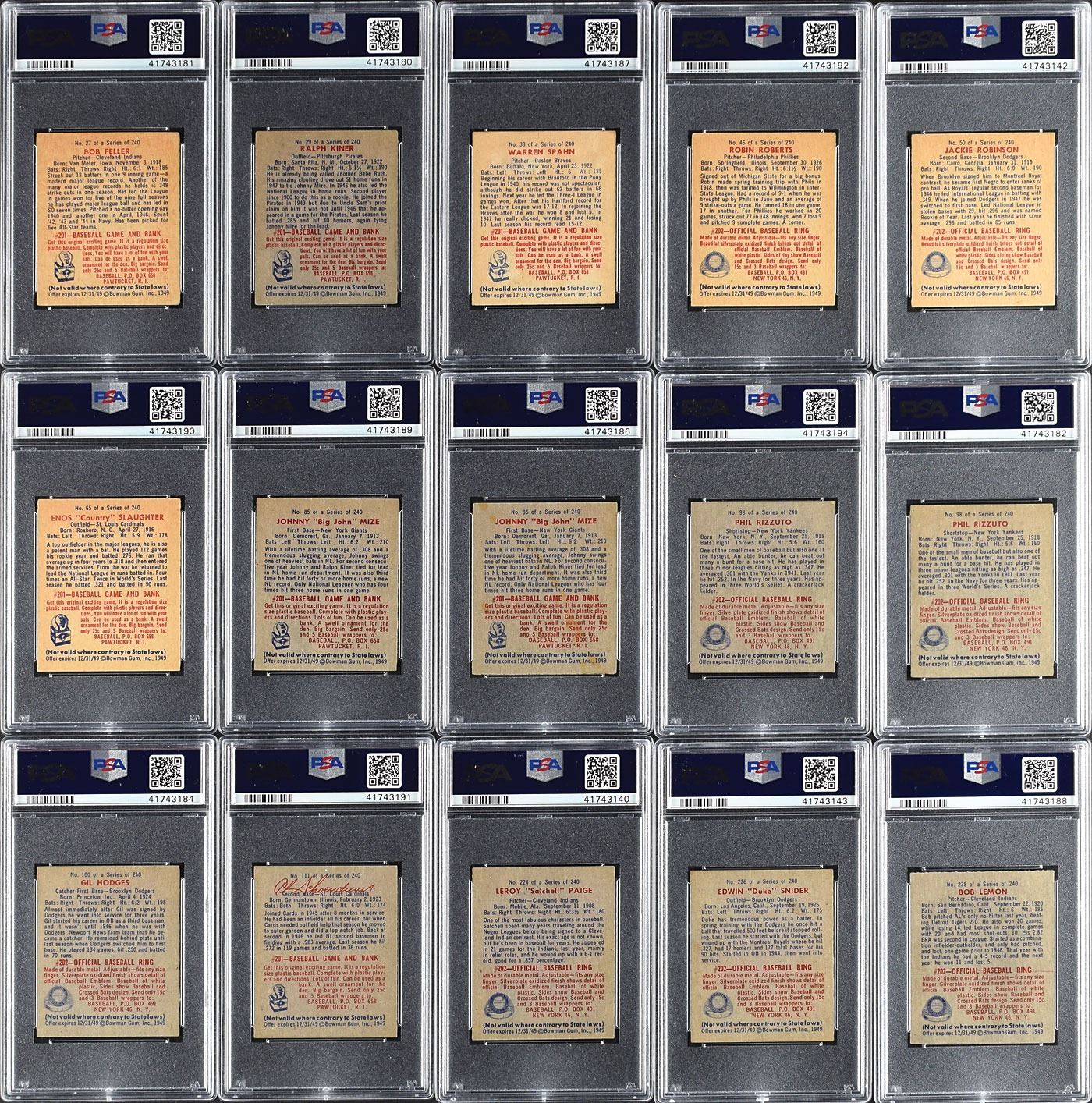 Ungraded Cards - 1 Bickford (VG/EX), 11 Boudreau (EX/MT), 23 Doerr (EX), 26 Kell (EX/MT), 70 Furillo (NM), 114 Reynolds (VG/EX), 162 Roe (EX/MT), 194 Branca (EX/MT), 209 Keller (EX/MT), 214 Ashburn (PSA), 225 Coleman (VG/EX), 229 Lopat (EX) and 240 Young (EX). Grades mostly EX to NM with 20% lesser.