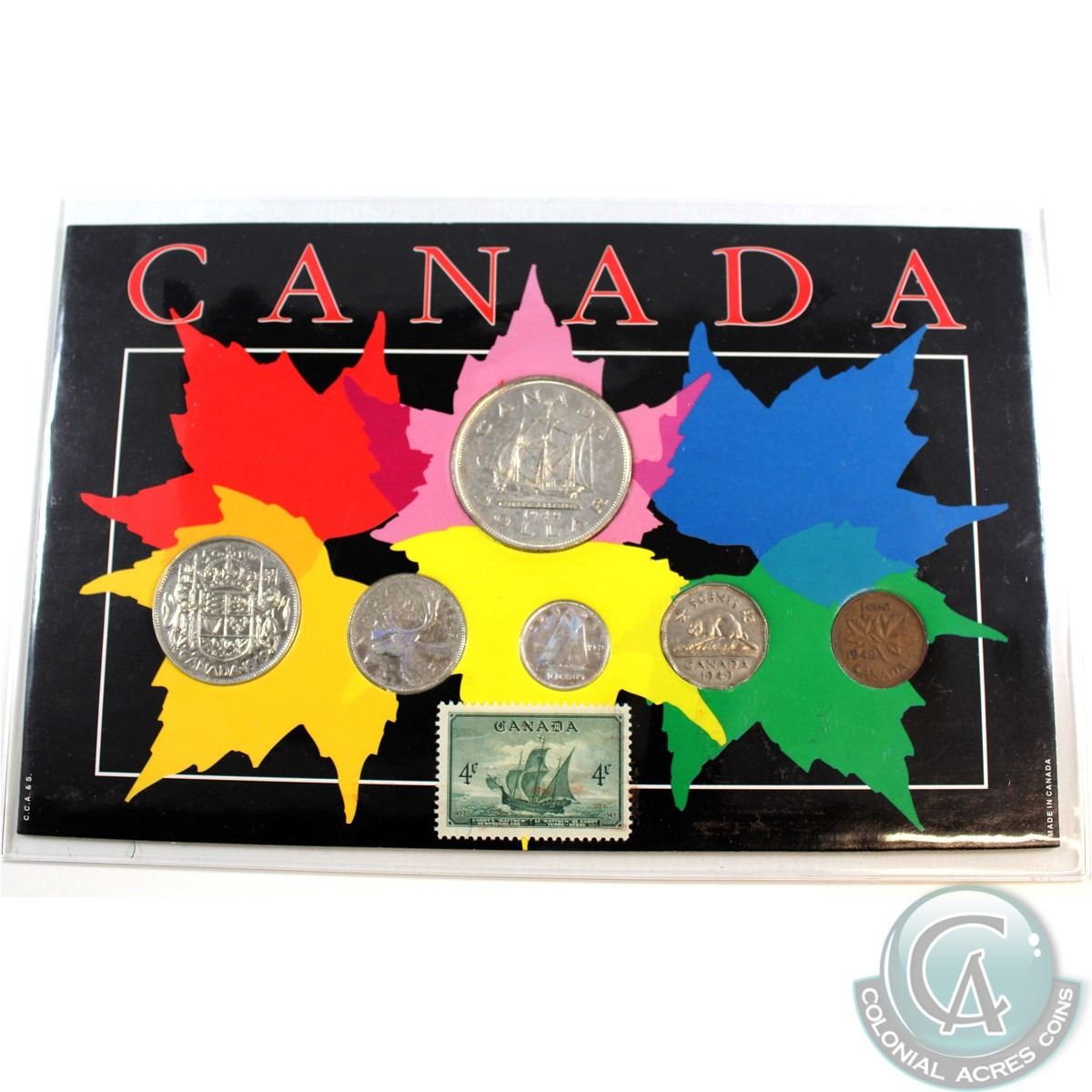1949 CANADA YEAR Set consisting of the Silver Dollar depicting the famous ship "THE MATTHEW SHIP" and also includes the original 4 Cent "MATTHEW" Ship STAMP nicely displayed along with the Silver 50 cents, Silver twenty-five cents, Silver ten cents, nickel and one cent coins in a special Canada Year Set Holder.