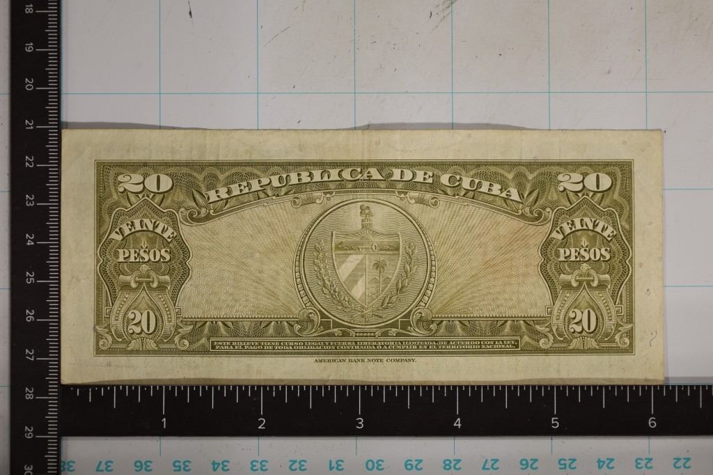 1949 CUBA 20 PESO BILL. WRITING ON THE OBVERSE