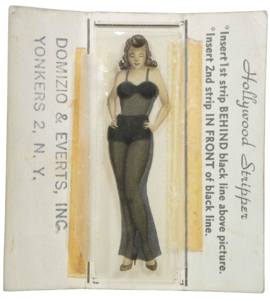 1949 Calendar, entitled "The Hollywood Stripper" advertisement for Domizio & Everts Inc. Yonkers 2NY. By inserting the small cards the strippers clothes are removed. Good condition. 3 /14 X 3 1/4 inches. Start Price $20