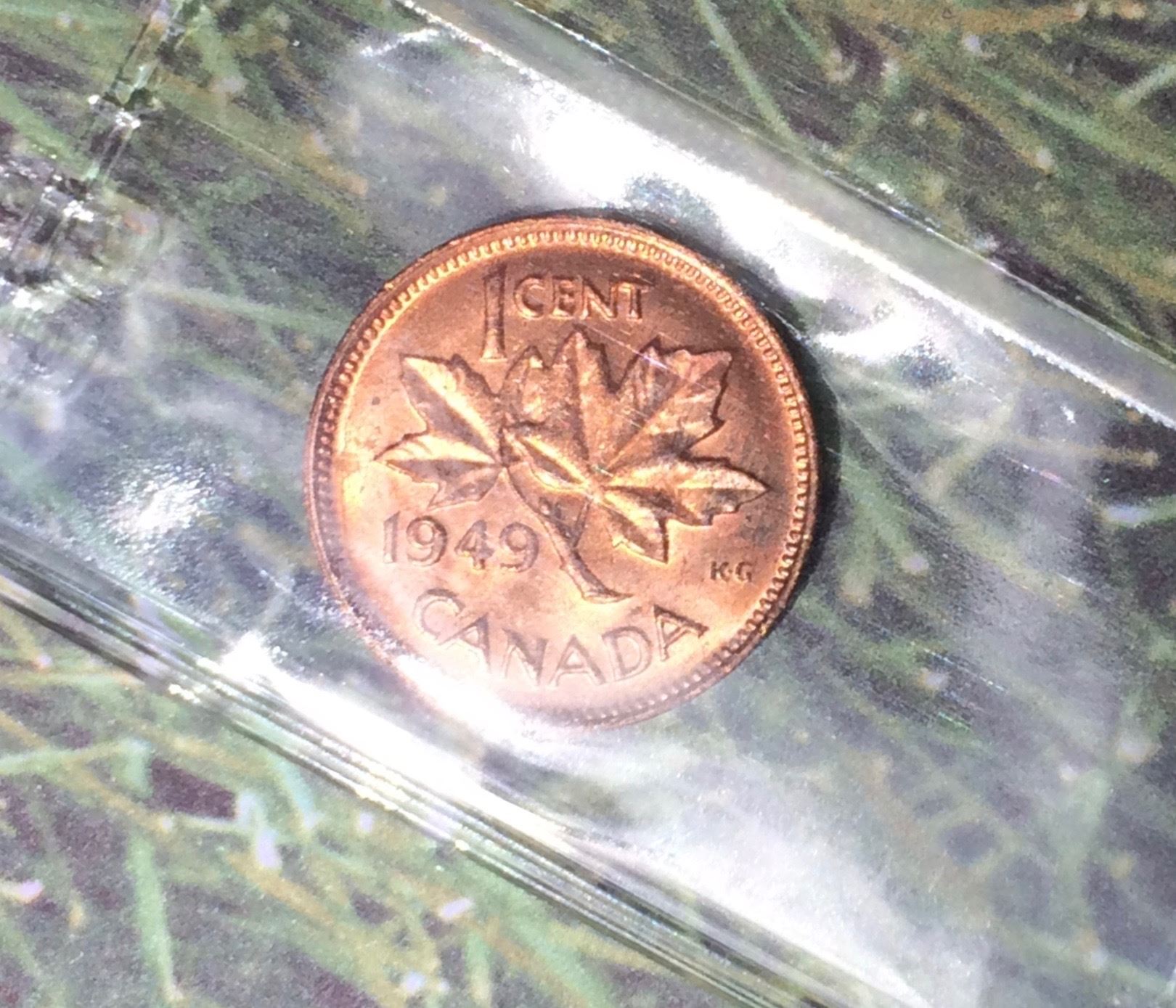 1949 Canada 1 Cent ICCS, MS-63, Off to Denticles, Scratches: Red.
