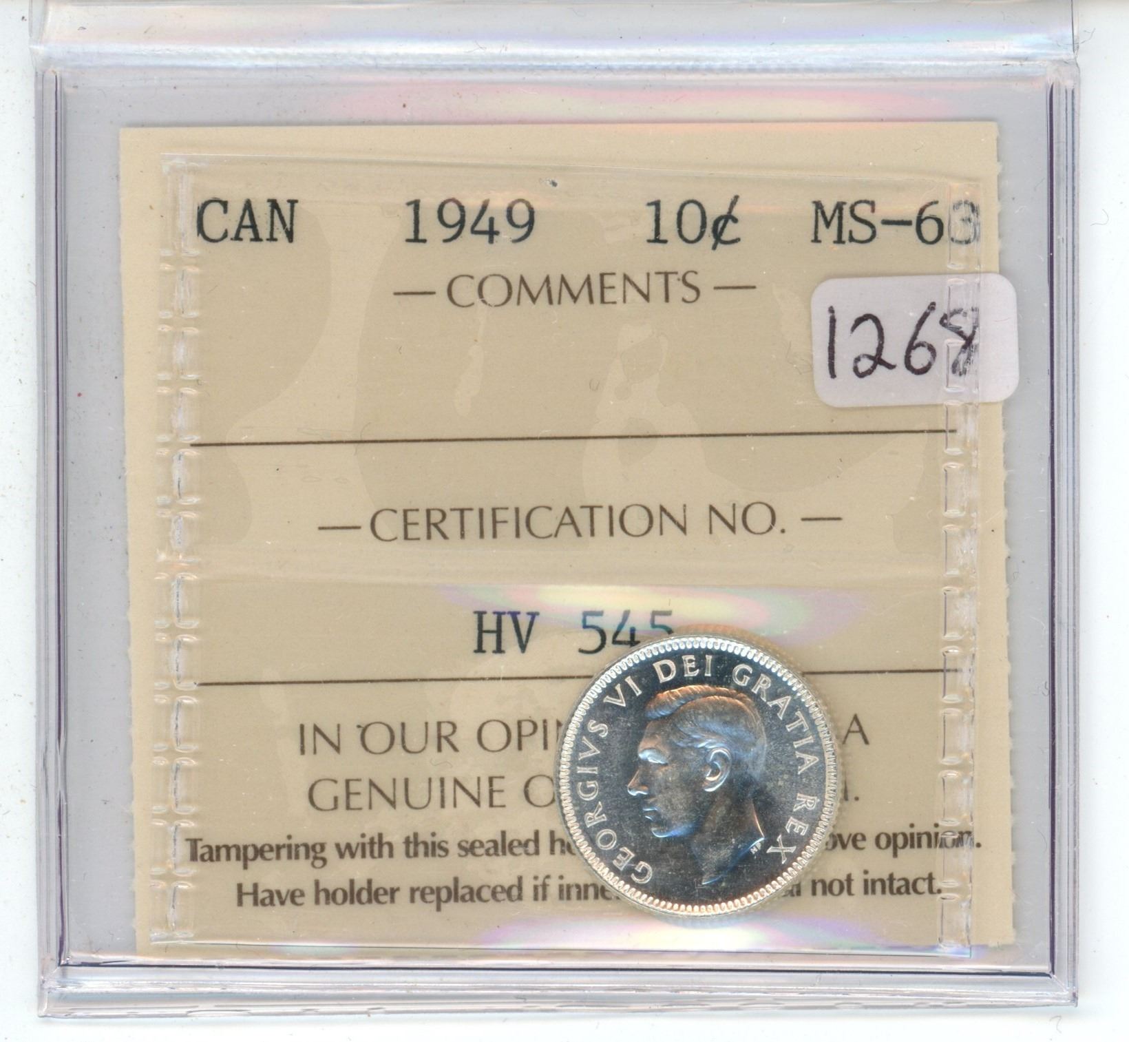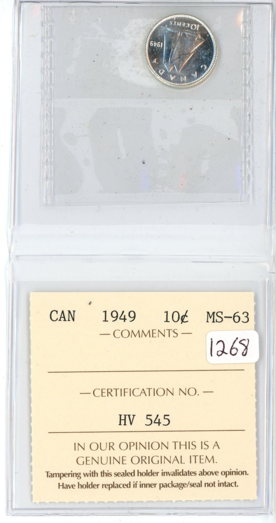 1949 Canadian graded silver 10 cent coin - ICCS - MS63