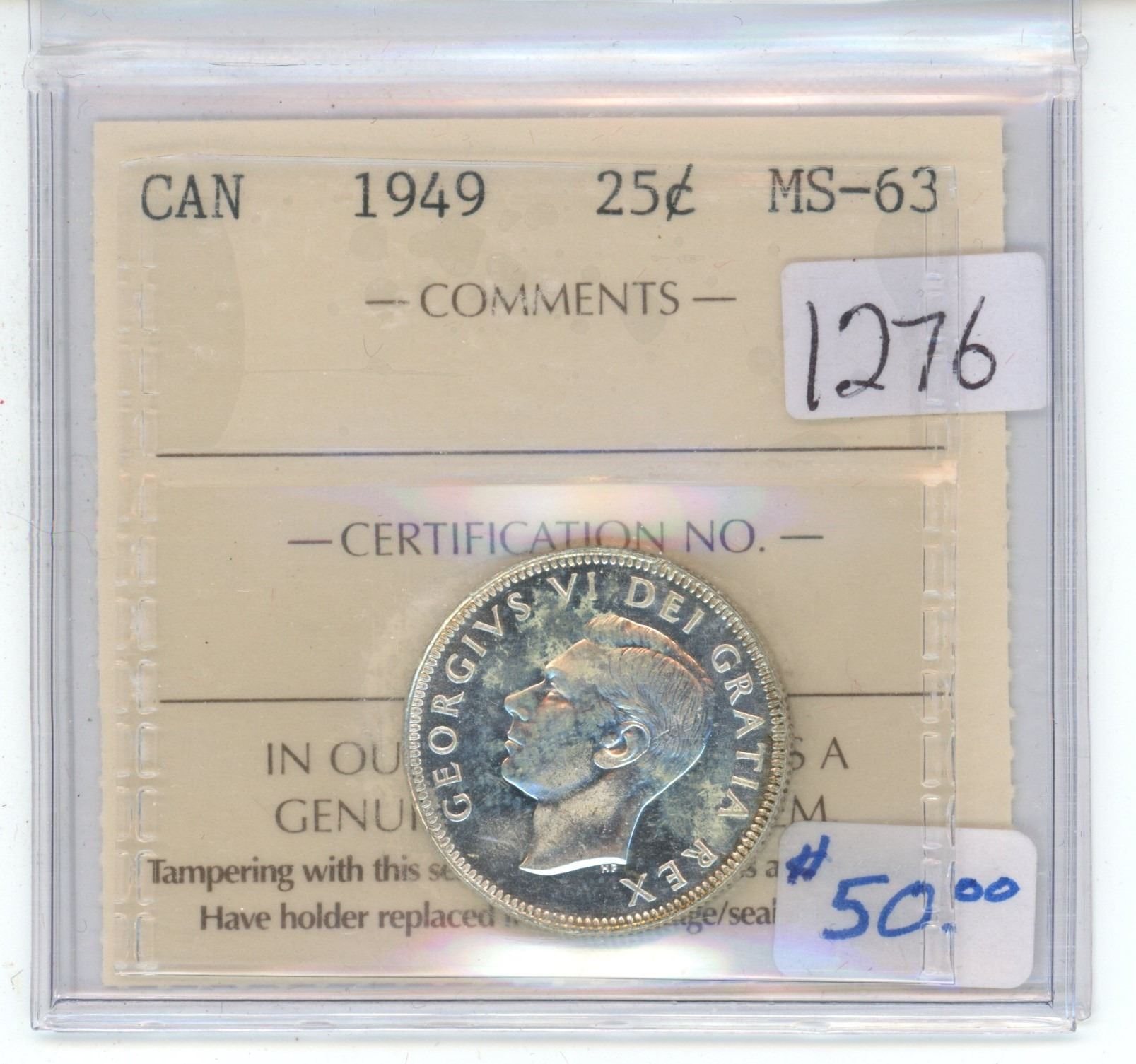 1949 Canadian graded silver, 25 cent coin - ICCS - MS63
