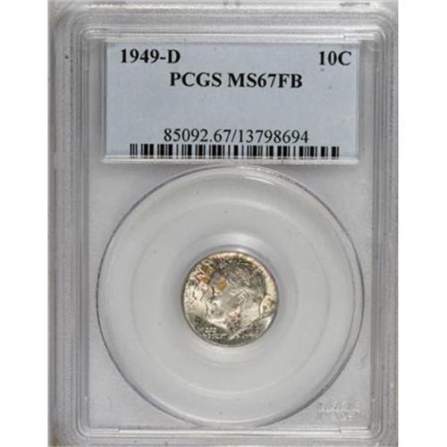 <B>1949-D 10C MS67 Full Bands PCGS.</B></I> PCGS Population (51/2). NGC Census: (0/0). Mintage: 26,034,000. (#85092)<BR><BR><B>Coin Engraver:</B> John R. Sinnock<BR><BR><b>Shipping:</b> Coins & Currency (<a target="_blank" href="http://www.heritageauctions.com/common/shipping.php">view shipping information</a>)