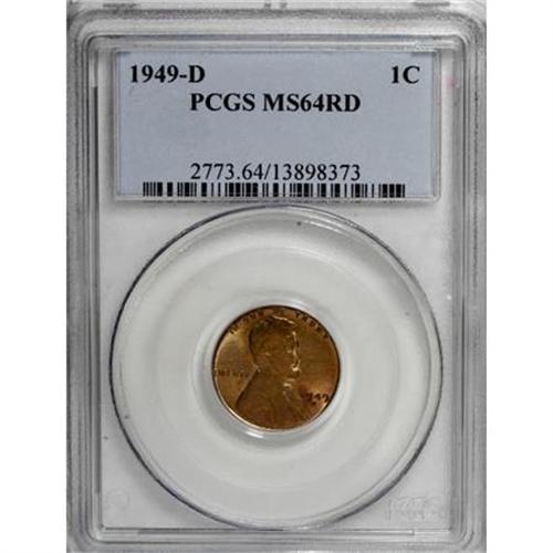 <B>1949-D 1C MS64 Red PCGS.</B></I> Intense luster is the chief hallmark of this visually arresting cent. Alluring lime-green and fire-red toning are also noted on both sides. Several spots and small contact marks on the upper right side of the obverse preclude the Gem assessment. <BR><BR><B>Coin Engraver:</B> Victor D. Brenner<BR><BR><b>Shipping:</b> Coins & Currency (<a target="_blank" href="http://www.heritageauctions.com/common/shipping.php">view shipping information</a>)