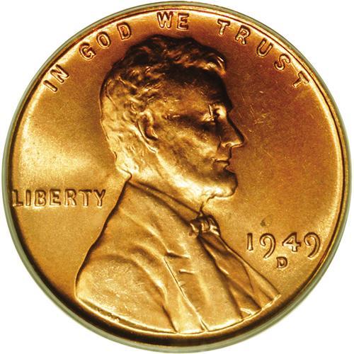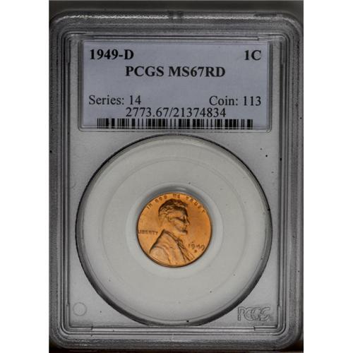 <B>1949-D<1C> MS67 Red PCGS.</B></I> Delicate rose accents mix with this Superb Gem's fiery orange brilliance. A small toning spot is noted above the first 9 in the date. Current population: 30 in 67, 0 finer (3/06).<BR><I>From The Kendall Marie #4 All-Time Finest PCGS Registry of Lincoln Cents with Varieties, Circulation Strikes, 1909-1958.</B></I> <BR><BR><B>Important notice:</B> Heritage usually auctions material at the rate of 200-250 lots per hour. On some occasions eBay Live bid software or the Internet may not be able to keep up with the pace of the auction. We recommend placing a realistic absentee bid now as insurance to avoid disappointment. Occasionally the auctioneer may eliminate or reject an eBay Live bid, and the auctioneer may also reopen a lot after the close of the eBay live bidding (usually because we missed an audience bid), and may reject your bid even if it shows you as the winning bidder. By bidding via eBay Live, you agree that Heritage may award the lot to another bidder at its sole discretion under the circumstances described above or any other reasonable circumstances. Since eBay bids are not shown to us until we open the lot on the floor, we treat those bids just like floor bids. In most cases the floor responds before the eBay bid is presented to us, due to Internet lag time, so for consistency we have made it a policy that floor bids are always considered first over tie eBay live bids. Also please note that all Heritage lots purchased through eBay Live carry a 20% Buyer's Premium. Please make sure you read the Terms and Conditions before you bid. This lot is being auctioned in conjunction with a live floor auction by Heritage Galleries & Auctioneers. All final auction and invoice information will be supplied by Heritage Galleries & Auctioneers, and all other information should be considered preliminary. Lot:571 <BR><BR><B>Winning Notification and Billing:</B> After the FINAL session in this auction is complete, Heritage will send e-mail and snail mail invoices. This process normally takes several days. All final auction and invoice information will be supplied by Heritage Galleries & Auctioneers, and all other information should be considered preliminary. <BR><BR>This auction will be conducted on a live auction floor and over the Internet through eBay Live. If you choose to place an absentee bid, please take a moment to <font color='#0000ff'><u><a href='http://pages.ebay.com/liveauctions/help/before/laabsentee.html'>learn how eBay Live absentee bidding works</a></u></font><font color='#000000'>