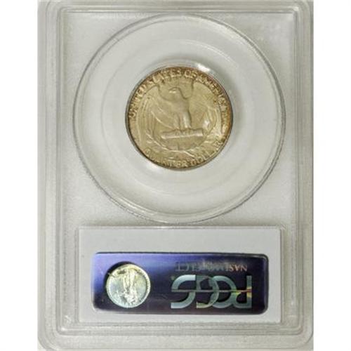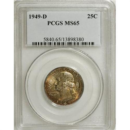 <B>1949-D 25C MS65 PCGS.</B></I> Well struck and lustrous with immaculately preserved surfaces and luscious amber-red toning across the obverse, as well as along the reverse border. An obverse fingerprint fails to lessen the appeal of this impressive Gem quarter. <BR><BR><B>Coin Engraver:</B> John Flanagan<BR><BR><b>Shipping:</b> Coins & Currency (<a target="_blank" href="http://www.heritageauctions.com/common/shipping.php">view shipping information</a>)