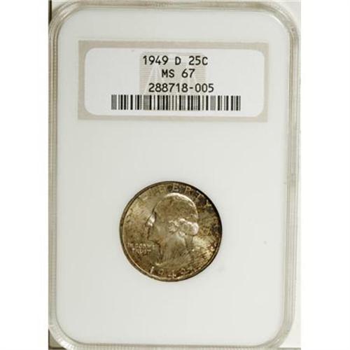<B>1949-D 25C MS67 NGC.</B></I> NGC Census: (127/2). PCGS Population (24/1). Mintage: 10,068,400. Numismedia Wsl. Price for NGC/PCGS coin in MS67: $280. (#5840)<BR><BR><B>Coin Engraver:</B> John Flanagan<BR><BR><b>Shipping:</b> Coins & Currency (<a target="_blank" href="http://www.heritageauctions.com/common/shipping.php">view shipping information</a>)
