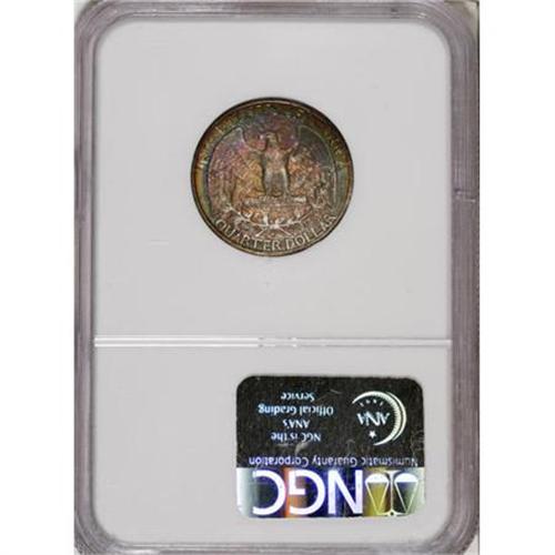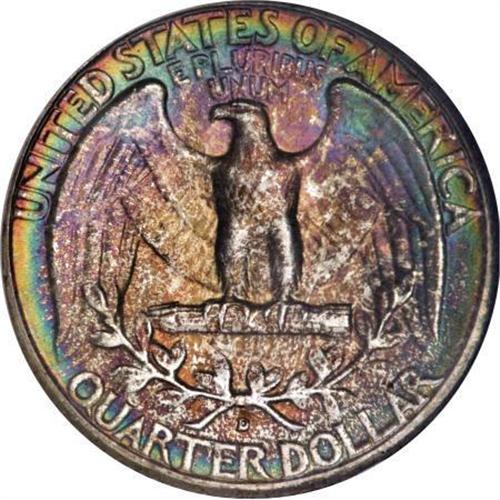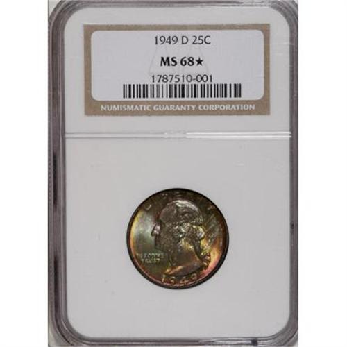 <B>1949-D 25C MS68 <img src="/images/star.gif" width="10" height="10" alt="" border="0"> NGC</B></I> The surfaces of this coin approach technical perfection and each side is covered with the most attractive toning imaginable. A rich interplay of emerald-green, rose, and lavender colors is seen on both obverse and reverse with approximately the same weight and density of coloration on each side. This is the finest known. Population: 1 in 68 <B><img src="/images/star.gif" width="10" height="10" alt="" border="0"></B></I>, 0 finer (12/07).<BR><BR><B>Coin Engraver:</B> John Flanagan<BR><BR><b>Shipping:</b> Coins & Currency (<a target="_blank" href="http://www.heritageauctions.com/common/shipping.php">view shipping information</a>)