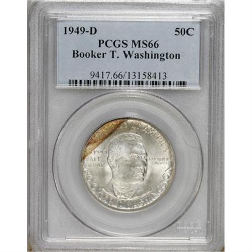 <B>1949-D 50C Booker T. Washington MS66 PCGS.</B></I> PCGS Population (182/12). NGC Census: (169/17). Mintage: 6,004. Numismedia Wsl. Price for NGC/PCGS coin in MS66: $240. (#9417)<BR><BR><b>Shipping:</b> Coins & Currency (<a target="_blank" href="http://www.heritageauctions.com/common/shipping.php">view shipping information</a>)