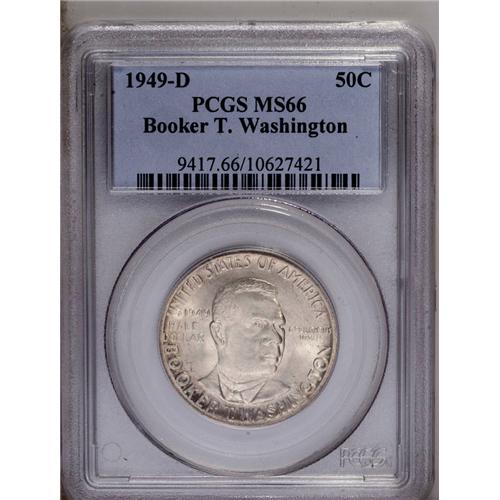 <B>1949-D<50C> Booker T. Washington MS66 PCGS.</B></I> This is a lovely Premium Gem example with highly lustrous obverse and reverse surfaces. Subtle gold color is visible on the reverse. Few finer quality examples of this issue have been certified, including just seven better coins graded by PCGS (5/06).