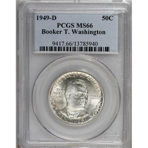 <B>1949-D 50C Booker T. Washington MS66 PCGS.</B></I> PCGS Population (194/13). NGC Census: (171/17). Mintage: 6,004. Numismedia Wsl. Price for NGC/PCGS coin in MS66: $240. (#9417)<BR><BR><b>Shipping:</b> Coins & Currency (<a target="_blank" href="http://www.heritageauctions.com/common/shipping.php">view shipping information</a>)