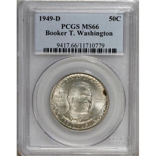 <B>1949-D 50C Booker T. Washington MS66 PCGS.</B></I> PCGS Population (194/13). NGC Census: (175/16). Mintage: 6,004. Numismedia Wsl. Price for NGC/PCGS coin in MS66: $240. (#9417)<BR><BR><b>Shipping:</b> Coins & Currency (<a target="_blank" href="http://www.heritageauctions.com/common/shipping.php">view shipping information</a>)