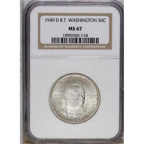 <B>1949-D 50C Booker T. Washington MS67 NGC.</B></I> Sharply struck with excellent luster. A thin veneer of ice-blue on the obverse is joined by faint tan-beige on the reverse. A few tiny marks are noted on the portrait. No coins have been graded finer by either grading service (10/06).<BR><BR><b>Shipping:</b> Coin/Currency (<a target="_blank" href="http://www.heritageauctions.com/common/shipping.php">view shipping information</a>)