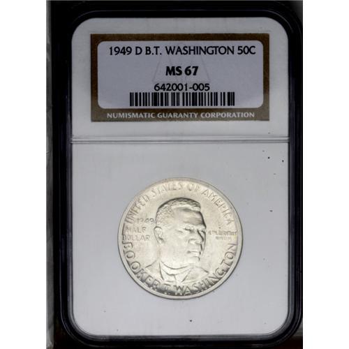 <B>1949-D<50C> Booker T. Washington MS67 NGC.</B></I> An important opportunity to acquire this scarce and underrated issue. The surfaces are fully lustrous with brilliant silver color, tending toward pale champagne. Census: 12 in 67, 0 finer (2/06).