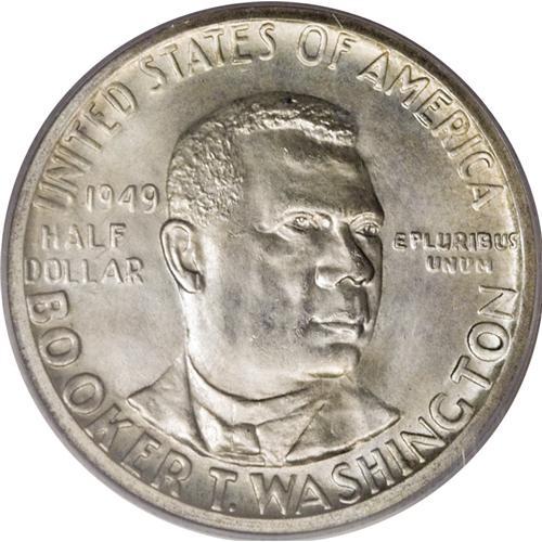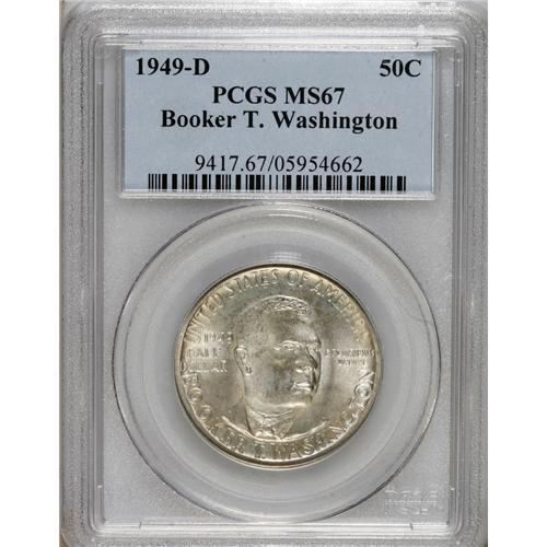 <B>1949-D 50C Booker T. Washington MS67 PCGS.</B></I> Delicate straw-gold and ice-blue patina graces this satiny and exquisitely preserved Superb Gem. Technically immaculate, since the minute contact on the portrait is actually from the planchet prior to the strike. The mintage is a net 6,000 pieces, per Breen. Population: 12 in 67, 0 finer (3/07).<BR><BR><b>Shipping:</b> Coins & Currency (<a target="_blank" href="http://www.heritageauctions.com/common/shipping.php">view shipping information</a>)