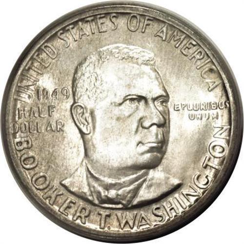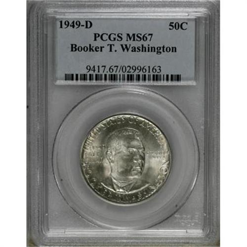 <B>1949-D 50C Booker T. Washington MS67 PCGS.</B></I> Potent luster embraces each side of this commemorative half, and a well executed strike imparts virtual completeness to the motifs. Streaks of olive-green are somewhat more extensive and deeper in hue on the obverse. This piece has been carefully preserved throughout. Population: 13 in 67, 0 finer (3/08).<BR><BR><b>Shipping:</b> Coins & Currency (<a target="_blank" href="http://www.heritageauctions.com/common/shipping.php">view shipping information</a>)