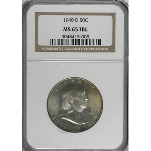 <B>1949-D 50C MS65 Full Bell Lines NGC.</B></I> NGC Census: (117/1). PCGS Population (368/16). Numismedia Wsl. Price for NGC/PCGS coin in MS65: $500. (#86654)<BR><BR><b>Shipping:</b> Coins & Currency (<a target="_blank" href="http://www.heritageauctions.com/common/shipping.php">view shipping information</a>)