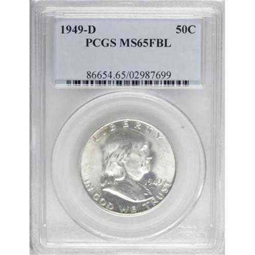 <B>1949-D 50C MS65 Full Bell Lines PCGS.</B></I> PCGS Population (0/0). NGC Census: (105/1). Numismedia Wsl. Price for NGC/PCGS coin in MS65: $625. (#86654)<BR><BR><b>Shipping:</b> Coins & Currency (<a target="_blank" href="http://www.heritageauctions.com/common/shipping.php">view shipping information</a>)
