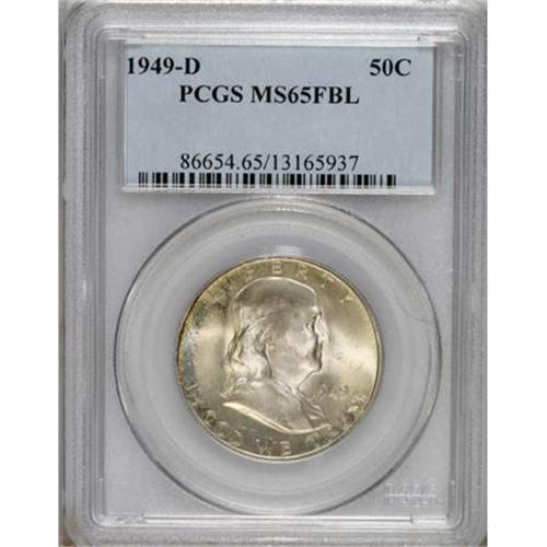<B>1949-D 50C MS65 Full Bell Lines PCGS.</B></I> PCGS Population (365/16). NGC Census: (110/1). Numismedia Wsl. Price for NGC/PCGS coin in MS65: $500. (#86654)<BR><BR><b>Shipping:</b> Coins & Currency (<a target="_blank" href="http://www.heritageauctions.com/common/shipping.php">view shipping information</a>)