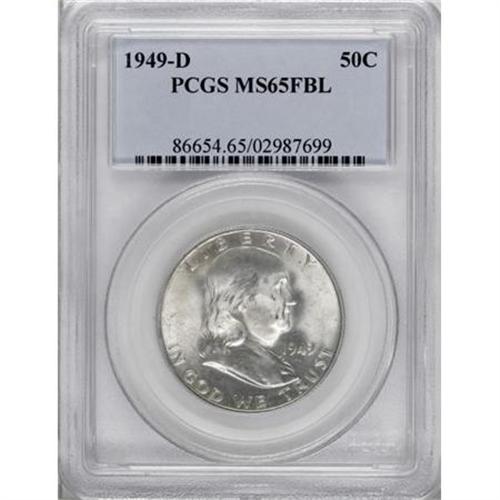 <B>1949-D 50C MS65 Full Bell Lines PCGS.</B></I> PCGS Population (369/16). NGC Census: (123/1). Numismedia Wsl. Price for NGC/PCGS coin in MS65: $525. (#86654)<BR><BR><b>Shipping:</b> Coins & Currency (<a target="_blank" href="http://www.heritageauctions.com/common/shipping.php">view shipping information</a>)