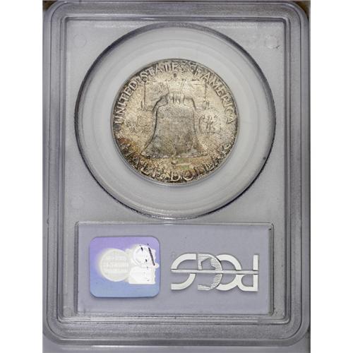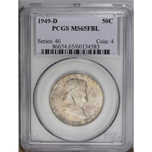 <B>1949-D<50C> MS65 Full Bell Lines PCGS.</B></I> Another difficult issue in this series. The mottled toning is gray, blue, and amber on this appealing coin. The bell lines are expectedly bold, and considerable luster emanates from beneath the translucent patina. Only a couple of light scrapes on Franklin's hair are worthy of mention. PCGS has graded 16 pieces finer (3/06). <BR><BR><B>Important notice:</B> Heritage usually auctions material at the rate of 200-250 lots per hour. On some occasions eBay Live bid software or the Internet may not be able to keep up with the pace of the auction. We recommend placing a realistic absentee bid now as insurance to avoid disappointment. Occasionally the auctioneer may eliminate or reject an eBay Live bid, and the auctioneer may also reopen a lot after the close of the eBay live bidding (usually because we missed an audience bid), and may reject your bid even if it shows you as the winning bidder. By bidding via eBay Live, you agree that Heritage may award the lot to another bidder at its sole discretion under the circumstances described above or any other reasonable circumstances. Since eBay bids are not shown to us until we open the lot on the floor, we treat those bids just like floor bids. In most cases the floor responds before the eBay bid is presented to us, due to Internet lag time, so for consistency we have made it a policy that floor bids are always considered first over tie eBay live bids. Also please note that all Heritage lots purchased through eBay Live carry a 20% Buyer's Premium. Please make sure you read the Terms and Conditions before you bid. This lot is being auctioned in conjunction with a live floor auction by Heritage Galleries & Auctioneers. All final auction and invoice information will be supplied by Heritage Galleries & Auctioneers, and all other information should be considered preliminary. Lot:3078 <BR><BR><B>Winning Notification and Billing:</B> After the FINAL session in this auction is complete, Heritage will send e-mail and snail mail invoices. This process normally takes several days. All final auction and invoice information will be supplied by Heritage Galleries & Auctioneers, and all other information should be considered preliminary. <BR><BR>This auction will be conducted on a live auction floor and over the Internet through eBay Live. If you choose to place an absentee bid, please take a moment to <font color='#0000ff'><u><a href='http://pages.ebay.com/liveauctions/help/before/laabsentee.html'>learn how eBay Live absentee bidding works</a></u></font><font color='#000000'>