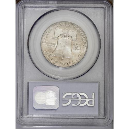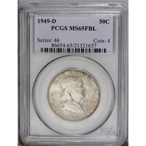 <B>1949-D<50C> MS65 Full Bell Lines PCGS.</B></I> Blended chestnut and dove-gray coloration attests to the originality of this lustrous and sharply struck Gem. The obverse is essentially pristine, and the reverse shows only moderate contact on the A in HALF and above the bell inscription. <BR><BR><B>Important notice:</B> Heritage usually auctions material at the rate of 200-250 lots per hour. On some occasions eBay Live bid software or the Internet may not be able to keep up with the pace of the auction. We recommend placing a realistic absentee bid now as insurance to avoid disappointment. Occasionally the auctioneer may eliminate or reject an eBay Live bid, and the auctioneer may also reopen a lot after the close of the eBay live bidding (usually because we missed an audience bid), and may reject your bid even if it shows you as the winning bidder. By bidding via eBay Live, you agree that Heritage may award the lot to another bidder at its sole discretion under the circumstances described above or any other reasonable circumstances. Since eBay bids are not shown to us until we open the lot on the floor, we treat those bids just like floor bids. In most cases the floor responds before the eBay bid is presented to us, due to Internet lag time, so for consistency we have made it a policy that floor bids are always considered first over tie eBay live bids. Also please note that all Heritage lots purchased through eBay Live carry a 20% Buyer's Premium. Please make sure you read the Terms and Conditions before you bid. This lot is being auctioned in conjunction with a live floor auction by Heritage Galleries & Auctioneers. All final auction and invoice information will be supplied by Heritage Galleries & Auctioneers, and all other information should be considered preliminary. Lot:3079 <BR><BR><B>Winning Notification and Billing:</B> After the FINAL session in this auction is complete, Heritage will send e-mail and snail mail invoices. This process normally takes several days. All final auction and invoice information will be supplied by Heritage Galleries & Auctioneers, and all other information should be considered preliminary. <BR><BR>This auction will be conducted on a live auction floor and over the Internet through eBay Live. If you choose to place an absentee bid, please take a moment to <font color='#0000ff'><u><a href='http://pages.ebay.com/liveauctions/help/before/laabsentee.html'>learn how eBay Live absentee bidding works</a></u></font><font color='#000000'>