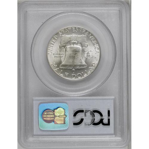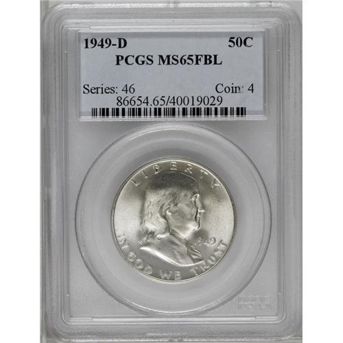 <B>1949-D<50C> MS65 Full Bell Lines PCGS.</B></I> This flashy untoned Gem displays full striking details, especially on the all-important bell lines, as well as on the lettering of the upper Liberty Bell. The bright luster is essentially unbroken across both sides, but a few tiny contact marks prevent an even higher grade assessment.<BR><I>From The Alex & Nan Registry Sets.</B></I> <BR><BR><B>Important notice:</B> Heritage usually auctions material at the rate of 200-250 lots per hour. On some occasions eBay Live bid software or the Internet may not be able to keep up with the pace of the auction. We recommend placing a realistic absentee bid now as insurance to avoid disappointment. Occasionally the auctioneer may eliminate or reject an eBay Live bid, and the auctioneer may also reopen a lot after the close of the eBay live bidding (usually because we missed an audience bid), and may reject your bid even if it shows you as the winning bidder. By bidding via eBay Live, you agree that Heritage may award the lot to another bidder at its sole discretion under the circumstances described above or any other reasonable circumstances. Since eBay bids are not shown to us until we open the lot on the floor, we treat those bids just like floor bids. In most cases the floor responds before the eBay bid is presented to us, due to Internet lag time, so for consistency we have made it a policy that floor bids are always considered first over tie eBay live bids. Also please note that all Heritage lots purchased through eBay Live carry a 20% Buyer's Premium. Please make sure you read the Terms and Conditions before you bid. This lot is being auctioned in conjunction with a live floor auction by Heritage Galleries & Auctioneers. All final auction and invoice information will be supplied by Heritage Galleries & Auctioneers, and all other information should be considered preliminary. Lot:3077 <BR><BR><B>Winning Notification and Billing:</B> After the FINAL session in this auction is complete, Heritage will send e-mail and snail mail invoices. This process normally takes several days. All final auction and invoice information will be supplied by Heritage Galleries & Auctioneers, and all other information should be considered preliminary. <BR><BR>This auction will be conducted on a live auction floor and over the Internet through eBay Live. If you choose to place an absentee bid, please take a moment to <font color='#0000ff'><u><a href='http://pages.ebay.com/liveauctions/help/before/laabsentee.html'>learn how eBay Live absentee bidding works</a></u></font><font color='#000000'>